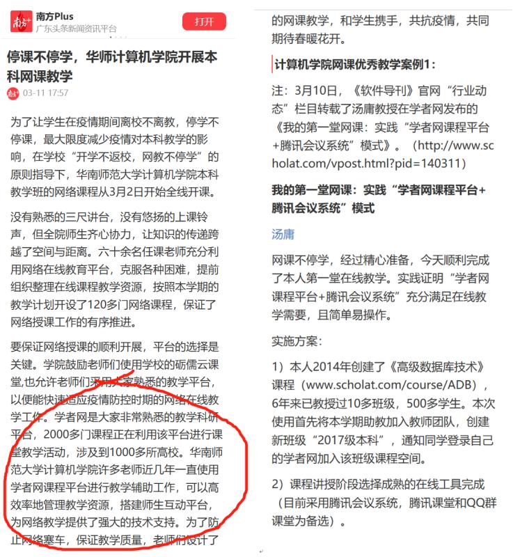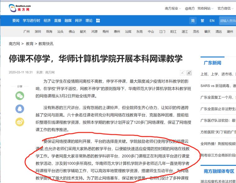 3月11日,南方+廣東教育頭條新聞,南方網(wǎng)-教育快訊以題為”停課不停學(xué),華師計算機學(xué)院開展本科網(wǎng)課教學(xué)”報道華南師范大學(xué)計算機學(xué)院應(yīng)用學(xué)者網(wǎng)開展網(wǎng)課教學(xué)。