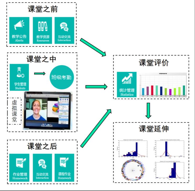 每個(gè)系統(tǒng)的設(shè)計(jì)都面向的用戶群體和需求,學(xué)者網(wǎng)設(shè)計(jì)目標(biāo)主要是為國(guó)內(nèi)外學(xué)者提供學(xué)術(shù)空間和學(xué)術(shù)交流,目前不支持在線視頻功能,不能構(gòu)建“虛擬課堂”,完成課堂講授工作。學(xué)者網(wǎng)課程平臺(tái)能夠很好地滿足課堂之前、課堂之后、課堂評(píng)價(jià)和課堂延伸4個(gè)階段的教學(xué)需求。第二階段的“課堂講授”就需要混合使用其它在線視屏系統(tǒng)來(lái)完成了。混合在線課程教學(xué)模式如下圖: