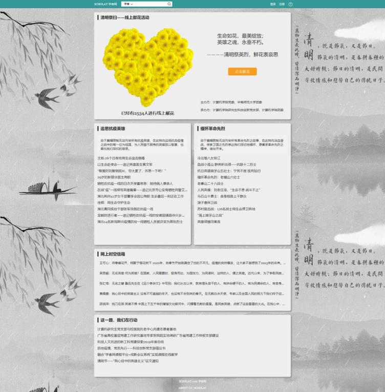 為響應(yīng)民政部辦公廳《關(guān)于做好2020年清明節(jié)祭掃工作的通知》,呼吁師生追思抗疫英雄,緬懷革命先烈,由計(jì)算機(jī)學(xué)院黨委和校團(tuán)委主辦、計(jì)算機(jī)學(xué)院研究生科技創(chuàng)新黨支部和計(jì)算機(jī)學(xué)院團(tuán)委共同承辦的“清明祭掃——線上獻(xiàn)花活動(dòng)”于4月4日上線,并在華南師大團(tuán)委“紫荊青年”公眾號(hào)同步開展。
