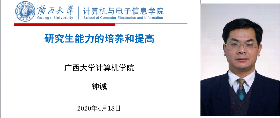 報(bào)告二:廣西大學(xué)計(jì)算機(jī)學(xué)院院長(zhǎng)鐘誠(chéng)教授《研究生能力的培養(yǎng)和提高》,報(bào)告從研究生培養(yǎng)的各個(gè)環(huán)節(jié):課程學(xué)習(xí)、項(xiàng)目開(kāi)發(fā)、論文撰寫(xiě)以及對(duì)研究生學(xué)術(shù)水平評(píng)價(jià)等對(duì)研究生能力的培養(yǎng)和提高進(jìn)行了詳細(xì)的闡述。鐘教授認(rèn)為研究生能力的培養(yǎng)和提高是一個(gè)系統(tǒng)工程,貫穿于研究生培養(yǎng)過(guò)程的始終。