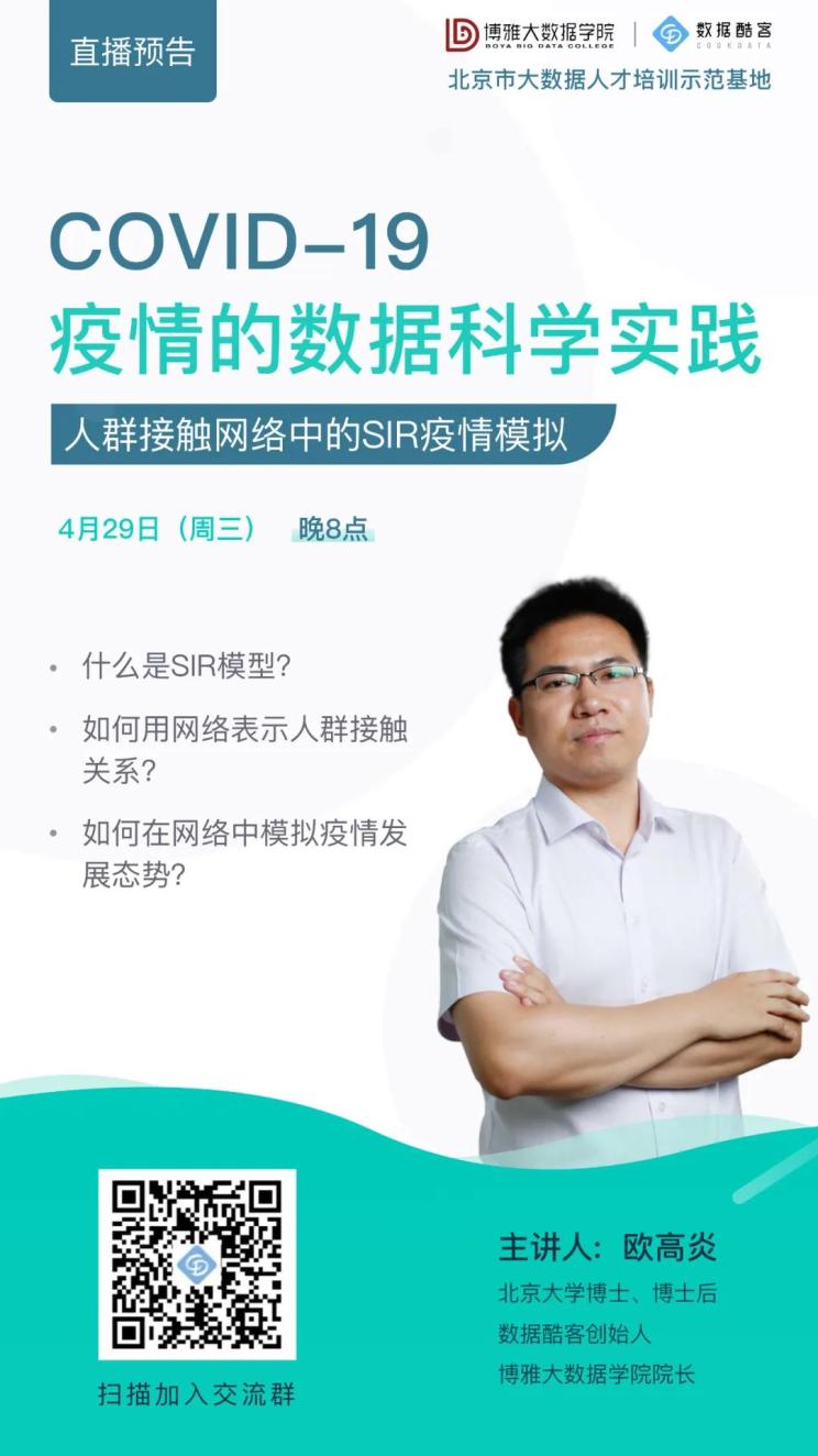 數(shù)據(jù)科學(xué)人工智能 數(shù)據(jù)科學(xué)人工智能 6天前 博雅大數(shù)據(jù)學(xué)院、數(shù)據(jù)酷客、北京市大數(shù)據(jù)人才培訓(xùn)示范基地舉辦的“COVID-19疫情的數(shù)據(jù)科學(xué)實(shí)踐”系列直播已成功舉辦四期。很多小伙伴反映還想聽到更多課程,為此我們特別推出新的一期,主題為“人群接觸網(wǎng)絡(luò)中的 SIR 疫情模擬”。 本次直播完全開放免費(fèi)。適合大數(shù)據(jù)專業(yè)學(xué)生、大數(shù)據(jù)愛好者,也對(duì)大數(shù)據(jù)教師開展實(shí)踐性教學(xué)具有重要參考價(jià)值。 歐高炎,北京大學(xué)博士、博士后。數(shù)據(jù)酷客創(chuàng)始人。博雅大數(shù)據(jù)學(xué)院院長(zhǎng)。 2020年4月29日(周三) 晚8點(diǎn) 介紹SIR模型,圖和網(wǎng)絡(luò)的基本知識(shí),使用 networkx 工具,以及生成的隨機(jī)圖和真實(shí)的網(wǎng)絡(luò)數(shù)據(jù),實(shí)現(xiàn)網(wǎng)絡(luò)中的 SIR 模型進(jìn)行疫情模擬。 如何用網(wǎng)絡(luò)來(lái)表示人之間的接觸關(guān)系?在接觸網(wǎng)絡(luò)中,如何通過(guò) SIR 模型模擬疫情的發(fā)展趨勢(shì)?主講人