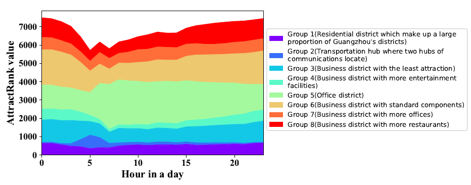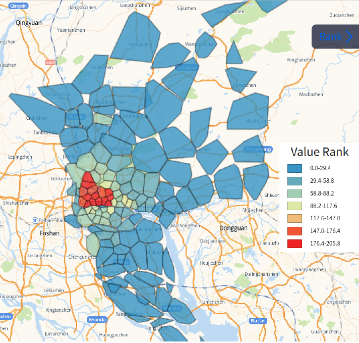 城市的區(qū)域吸引力排名可以展示城市的區(qū)域吸引力,幫助政府做出合理的城市規(guī)劃決策,因此有著非常重要的作用,但傳統(tǒng)的城市規(guī)劃方法主要依靠該地區(qū)的GDP、就業(yè)率、人口密度等方面進(jìn)行。但隨著越來越多的城市數(shù)據(jù)的爆炸式增長,此類信息的信息量相對(duì)較少,同時(shí)這些信息,同時(shí)只獨(dú)立代表一個(gè)地區(qū)的吸引力和不考慮地區(qū)間的相互影響。隨著智慧城市發(fā)展,我們應(yīng)該利用城市數(shù)據(jù)進(jìn)行城市規(guī)劃。為此,本文提出了一種名為AttractRank的區(qū)域吸引力排名方法,該方法首次將出租車大數(shù)據(jù)用于區(qū)域排名。首先,使用Constrained K-means算法將整個(gè)廣州市劃分為多個(gè)合理區(qū)域。其次,將原始的PageRank算法擴(kuò)展為與出租車的OD(origin-destination)經(jīng)緯度點(diǎn)集建立OD矩陣及距離矩陣,從而可以計(jì)算每個(gè)區(qū)域的吸引力排名。最后,通過可視化從AttractRank算法獲得的結(jié)果和案例研究。以成功地獲得城市區(qū)域吸引力如何隨時(shí)間動(dòng)態(tài)變化以及城市生活中有趣的發(fā)現(xiàn)的模式,因此可在城市規(guī)劃和城市數(shù)據(jù)挖掘中具有廣泛的應(yīng)用。同時(shí)本文開發(fā)了一個(gè)基于交通大數(shù)據(jù)的城市區(qū)域吸引力可視化系統(tǒng)。