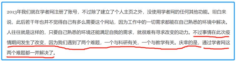 李教授說疫情期間“遇到了兩個(gè)難題,一個(gè)與科研有關(guān),一個(gè)與教學(xué)有關(guān)。慶幸的是,通過學(xué)者網(wǎng)這兩個(gè)難題都一并解決了?!?/span>