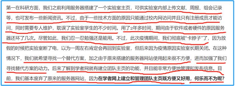 他說到:“在科研方面,我們之前利用服務(wù)器搭建了一個(gè)實(shí)驗(yàn)室主頁(yè),可供實(shí)驗(yàn)室內(nèi)部上傳文獻(xiàn)、周報(bào)、組會(huì)記錄等,也可發(fā)布一些新聞資訊。不過,由于一些技術(shù)方面的原因只能通過校內(nèi)網(wǎng)訪問并且只有注冊(cè)成員才能訪問,同時(shí)需要專人維護(hù),耽誤了實(shí)驗(yàn)室學(xué)生的不少時(shí)間?!?.....“后來了解到學(xué)者網(wǎng)就有建立團(tuán)隊(duì)主頁(yè)的功能,并且能非常方便地管理和發(fā)布信息。目前,我們基本廢棄了原來的服務(wù)器網(wǎng)站,因?yàn)?/span>在學(xué)者網(wǎng)上建立和管理團(tuán)隊(duì)主頁(yè)既方便又好用,何樂而不為呢?”