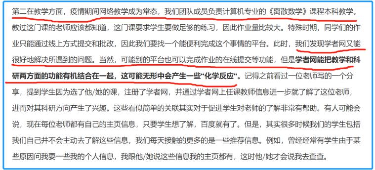 關(guān)于教學(xué)方面,李教授說:“疫情期間網(wǎng)絡(luò)教學(xué)成為常態(tài),我們團(tuán)隊(duì)成員負(fù)責(zé)計(jì)算機(jī)專業(yè)的《離散數(shù)學(xué)》課程本科教學(xué)。”......“特殊時(shí)期,同學(xué)們的作業(yè)只能通過線上方式提交和批改,因此我們要找一個(gè)能便利完成這個(gè)事情的平臺(tái)。此時(shí),我們發(fā)現(xiàn)學(xué)者網(wǎng)又能很好地解決所遇到的問題。當(dāng)然,可能別的平臺(tái)也可以完成作業(yè)的在線提交等功能,但是學(xué)者網(wǎng)能把教學(xué)和科研兩方面的功能有機(jī)結(jié)合在一起,這可能無(wú)形中會(huì)產(chǎn)生一些“化學(xué)反應(yīng)”。”