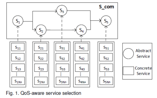 QoS預測對一些QoS感知的方法非常重要,比如圖1的基于QoS的服務選擇:復合服務S_com由幾個抽象服務(S1到S5)組成,每個抽象服務都可以從一組功能相似的具體服務(si1, si2, ..., siN)中選擇。QoS感知服務選擇的目的是從這些功能相似的服務集合中選擇合適的服務,形成一個優(yōu)化的復合服務。