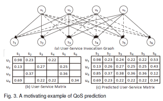 圖3是QoS預測的一個示例。在圖3(a)中,U={u1,u2,…,u4}為Web服務用戶集,S={s1,s2,…,s6}為Web服務集,E(實線)為U和S之間的調(diào)用集。ui和sj之間的連線eij表示用戶ui以前調(diào)用過Web服務sj。線段eij上的權重wij指的是該調(diào)用的QoS值(例如,響應時間等)。用戶服務調(diào)用可以由矩陣P表示,如圖3(b)所示。P中的每個值pij表示服務用戶ui觀察到的Web服務si的QoS值。P中缺少的QoS值表示對應的用戶和Web服務之間沒有調(diào)用。Web服務QoS預測問題可以定義為:給定已知的用戶調(diào)用Web服務的QoS值矩陣P(用戶-服務矩陣),預測P中缺失的QoS值。