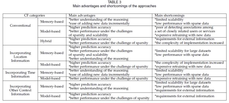基于內(nèi)存的方法利用用戶-服務矩陣中相似用戶或服務的局部信息來檢測鄰域關系,往往忽略了用戶的絕大多數(shù)QoS值,因此它們無法捕獲包含在用戶的所有QoS值中的弱信號?;谀P偷姆椒ɑ谟^測到的QoS數(shù)據(jù)構造一個全局模型,它們通常能有效地估計與大部分或所有服務相關的總體結構。然而,這些方法在檢測一組密切相關的用戶或服務之間的強關聯(lián)方面很差。基于內(nèi)存和基于模型的方法處理數(shù)據(jù)中不同層次的結構,因此它們都不是自己的最佳方法?;旌螩F方法結合了基于內(nèi)存和基于模型的方法,解決了上述CF方法的局限性,提高了預測性能。Table 3總結了基于內(nèi)存的、基于模型的以及混合的QoS預測方法的優(yōu)缺點。