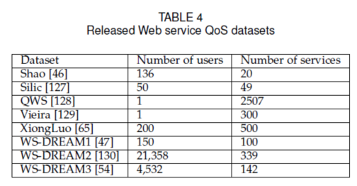 隨著各種Web服務QoS預測方法的深入研究,需要一個大規(guī)模的現(xiàn)實Web服務QoS數(shù)據(jù)集來比較它們的預測性能。在Table 4中,我們總結了一些用于QoS預測的數(shù)據(jù)集。