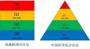 區(qū)別二:分區(qū)閾值不同。JCR分區(qū)是按每區(qū)25%的等比例進(jìn)行劃分,中科院分區(qū)的一區(qū)、二區(qū)和三區(qū)的閾值均高于JCR分區(qū)的一二三區(qū)。