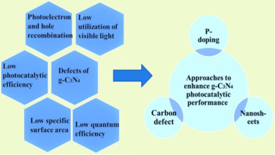 為了克服上述問題,人們提出了各種修飾方法,例如制備g-C3N4納米結(jié)構(gòu),共催化劑改性,構(gòu)建基于g-C3N4的異質(zhì)結(jié),元素和分子摻雜,以增強(qiáng)其光催化性能(綜述示意圖見圖1)。較大比表面積的g-C3N4納米結(jié)構(gòu)的可以提供更多的活性位點(diǎn)。