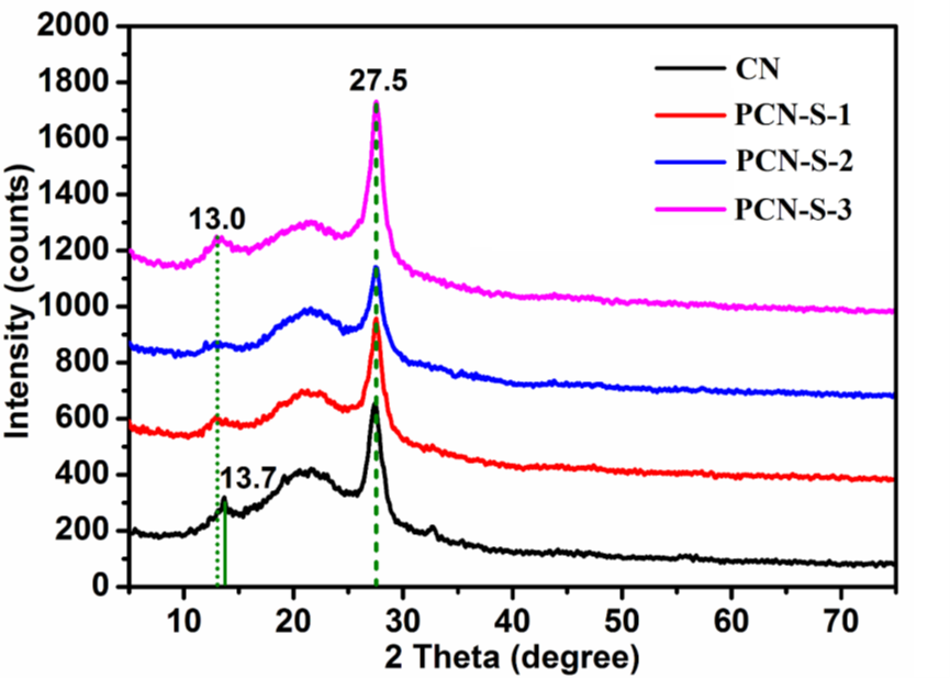眾所周知,X射線衍射(XRD)可以準(zhǔn)確地評(píng)價(jià)所制備的樣品的晶體結(jié)構(gòu)性質(zhì)。結(jié)果表明,CN的XRD圖中,在13.7度和27.5度附近有兩個(gè)明顯的衍射峰(圖2)。