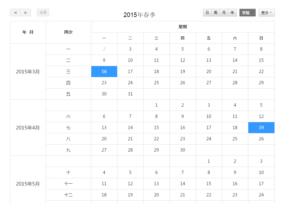 點擊已添加的學期,即轉(zhuǎn)到所定義的學期界面。在學期界面中背景為藍色表示這一天有已添加的事件。