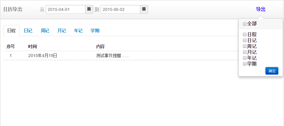 點擊“更多”下的“導出日歷”,即跳轉(zhuǎn)到導出日歷頁面,選擇導出時間,可預覽該時間段下的日程(即事件)、日記、周記等內(nèi)容。