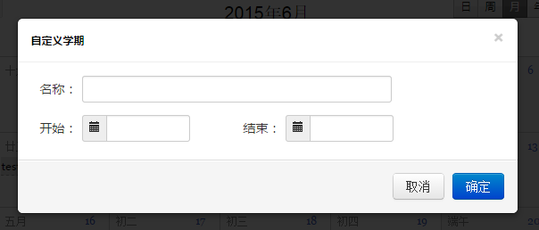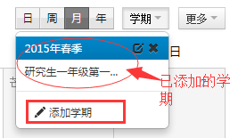 點擊“學期”,會出現(xiàn)一個下拉框,顯示已添加的學期以及添加學期按鈕。在已添加學期的右邊可以對該學期進行修改及刪除操作。點擊“添加學期”,即彈出自定義學期編輯框。