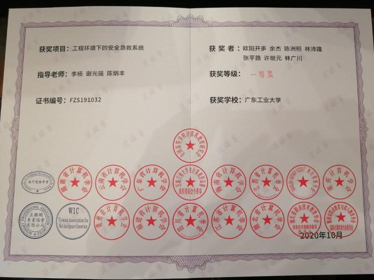 此次由QG工作室設(shè)計(jì)的作品《工程環(huán)境下的安全急救系統(tǒng)》經(jīng)過約一年時(shí)間的設(shè)計(jì)和優(yōu)化,代表廣東工業(yè)大學(xué)參加廣東分賽區(qū)的選拔,獲得一等獎(jiǎng)以及代表廣東省參加總決賽的資格。在總決賽中,參賽成員準(zhǔn)備充分,沉著冷靜,向評(píng)委們展示了工大學(xué)子的良好風(fēng)采和研究成果,獲得了評(píng)委們的一致認(rèn)可,最終在總決賽成功斬獲“金獎(jiǎng)”(一等獎(jiǎng)),為省為校爭(zhēng)得榮譽(yù)!在此,向獲獎(jiǎng)作品學(xué)生團(tuán)隊(duì)和指導(dǎo)老師表示熱烈的祝賀!