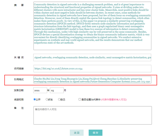 引用格式又稱參考文獻標準格式,是指為了撰寫論文而引用已經(jīng)發(fā)表的文獻的格式。本次新增該字段,便于學者們對論文進行檢索與引用。