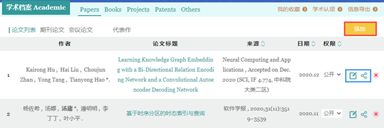 點擊添加按鈕,添加自己的論文;編輯論文按鈕,更新論文的相關(guān)信息;分享論文按鈕,將論文信息分享給好友。