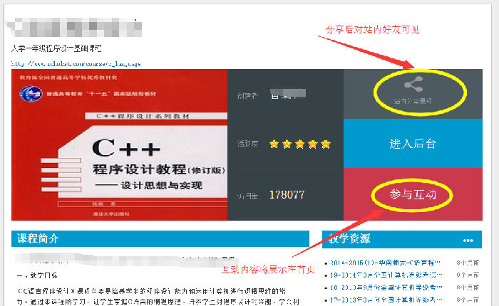 在首頁,提供了分享站內(nèi)課程、參與互動等功能。分享課程后,其他站內(nèi)用戶可以看到該分享信息,同時,通過“參與互動”,可以增加師生之間的互動。如圖4所示:
