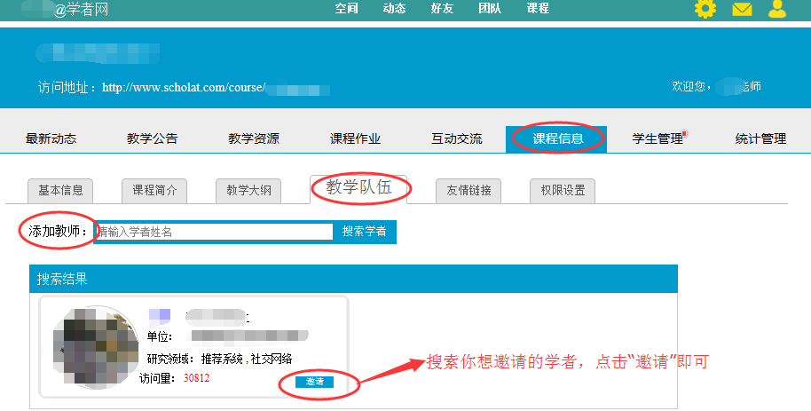 教學隊伍:可以邀請其他用戶加入到此門課程的教學團隊,如圖8.2所示: