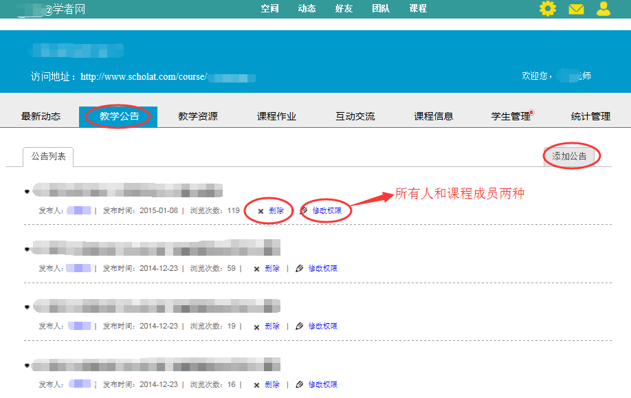 “所有人”—教師發(fā)布公告后,所有用戶均可在該課程首頁查看到該公告。