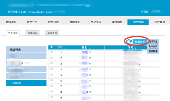 批量管理:可刪除學生、發(fā)站內信、更換班級。如圖9所示