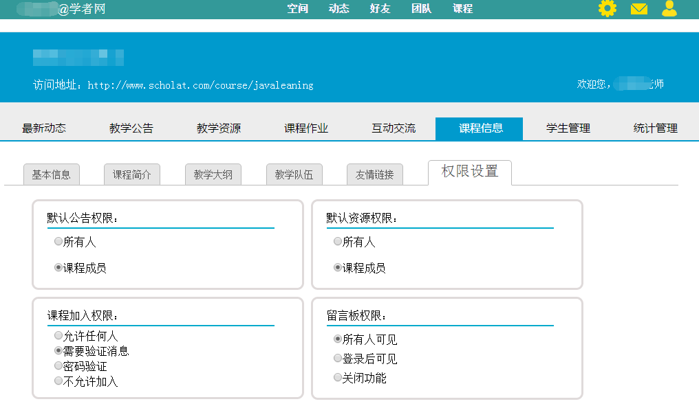“課程成員”--教師發(fā)布公告后,在課程首頁,只有該課程成員可以查看到該公告。