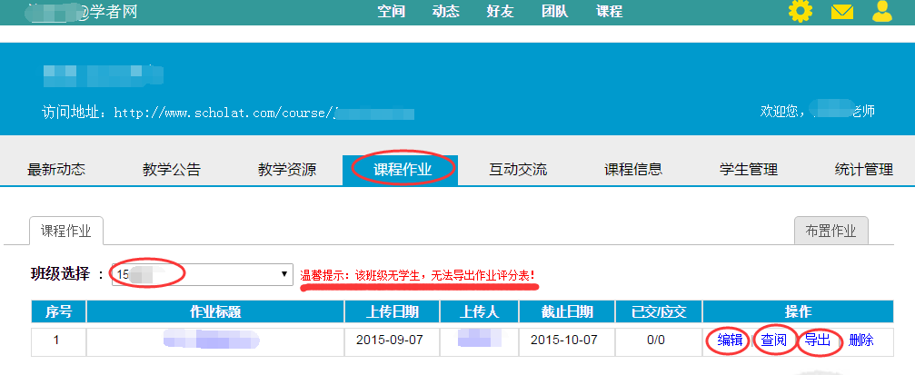 教師可以將一門課作業(yè)全部導出,也可以單獨下載某個學生某個作業(yè)。如果某個班級沒有學生,那么老師即使布置了作業(yè)也不能導出評分表。導出某個班級的作業(yè)導出,如圖5.1所示;某個班級沒有學生時導出評分表,如圖5.2所示: