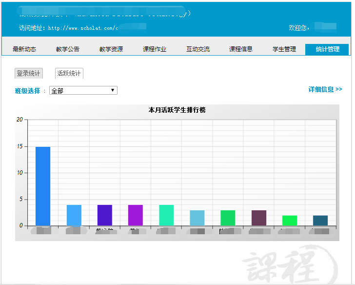 本門課程的教師,可以通過首頁(http://www.sibylla19999.cn/myCourses.html)“進入后臺”按鈕進入課程后臺。老師后臺提供豐富的教學功能:最新動態(tài)、教學公告、教學資源、課程作業(yè)、互動交流、課程信息、學生管理和登陸統(tǒng)計模塊。