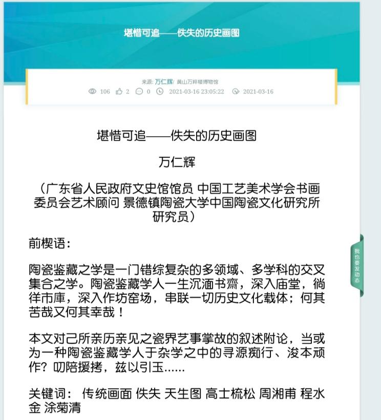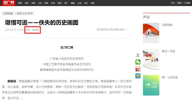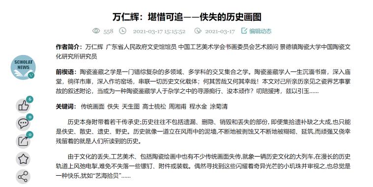 3月16日,廣東省人民政府文史館館員、中國工藝美術學會書畫委員會藝術顧問、景德鎮(zhèn)陶瓷大學中國陶瓷文化研究所研究員萬仁輝在學者網(wǎng)首發(fā)題為:“萬仁輝:堪惜可追——佚失的歷史圖畫”文章原文(見圖1)。