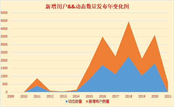 圖5 廣東工業(yè)大學(xué)新增用戶&&動態(tài)數(shù)量發(fā)布年變化圖