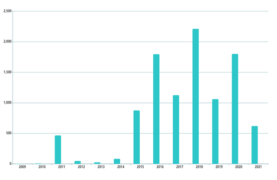 廣東工業(yè)大學(xué)動態(tài)發(fā)布數(shù)與新增用戶數(shù)變化曲線趨勢相同,總動態(tài)數(shù)量為9873條,09年動態(tài)數(shù)為5條,10年與09年數(shù)據(jù)量類似為3條,11年增長為418條,12,13年發(fā)布數(shù)為27條、77條,14年后隨著新增用戶逐漸變多,動態(tài)發(fā)布數(shù)也逐年提高,14年-20年,廣東工業(yè)大學(xué)的動態(tài)發(fā)布數(shù)分別為819、1712、1141、2245、1046、1805。