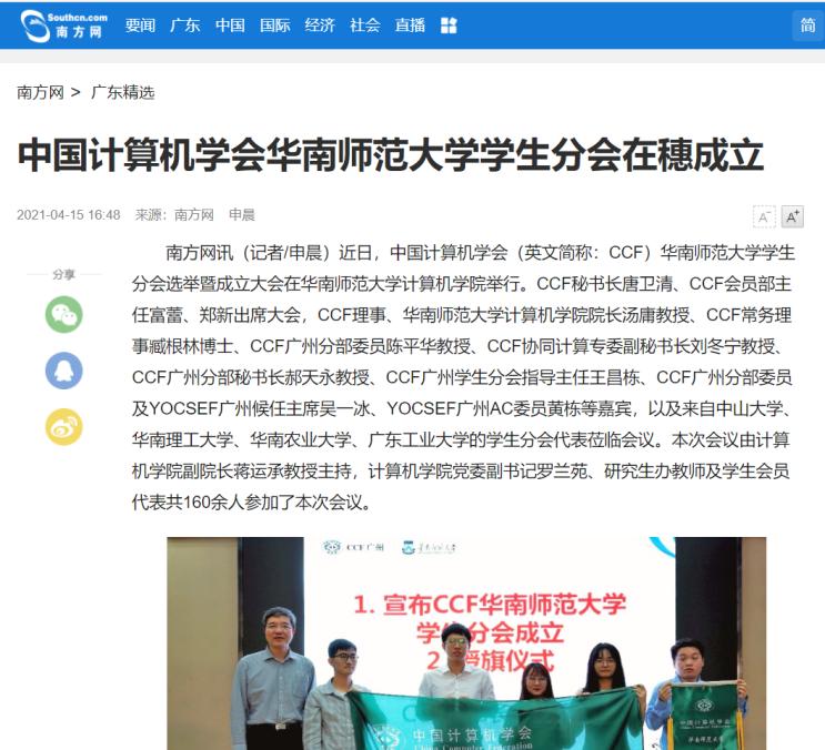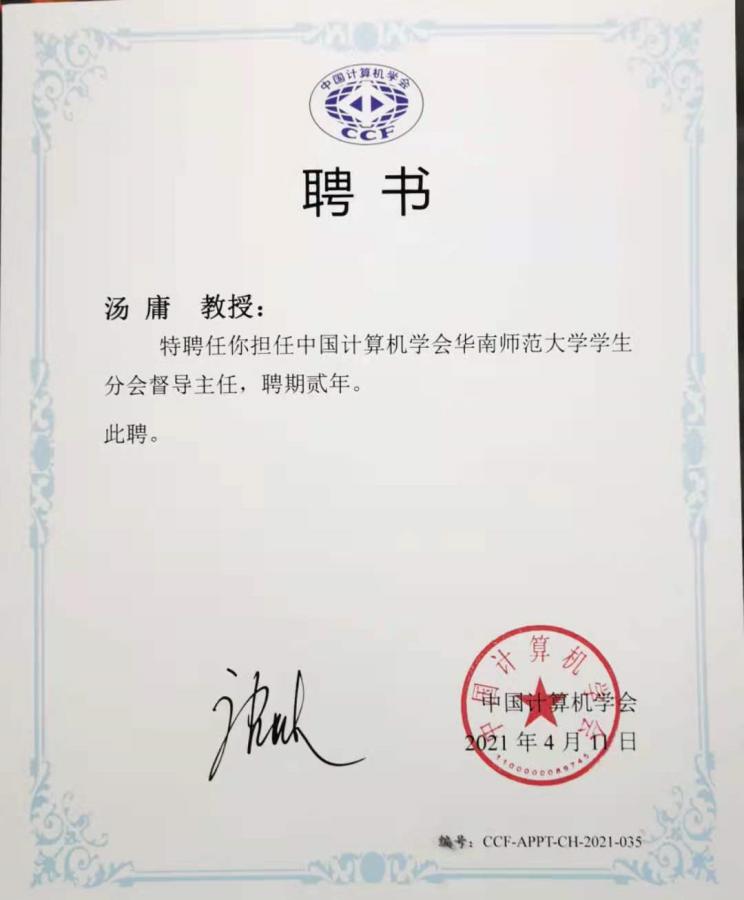 中國(guó)計(jì)算機(jī)學(xué)會(huì)華南師范大學(xué)學(xué)生分會(huì)成立,湯庸教授被聘為首屆督導(dǎo)主任。相關(guān)媒體光明日?qǐng)?bào)、新華網(wǎng)、南方網(wǎng)、網(wǎng)易、百度、學(xué)者網(wǎng)、中國(guó)計(jì)算機(jī)學(xué)會(huì)官網(wǎng)、華南師范大學(xué)新聞網(wǎng)等相繼報(bào)道。