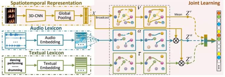由于需要識別同時出現(xiàn)的多個動作,多動作視頻識別具有極大的挑戰(zhàn)性。建立多動作關(guān)系模型對于理解具有多個動作的視頻是有益的和關(guān)鍵的,我們通過利用關(guān)系圖卷積網(wǎng)絡(luò)(GCN)和視頻的多模態(tài)性,提出了一個新穎的視頻多動作關(guān)系模型。我們首先建立了多模態(tài)的GCNs來探索模態(tài)感知的多動作關(guān)系,將特定模態(tài)的動作表示作為節(jié)點特征,然后將多模態(tài)的CNN-GCN模型和多模態(tài)的特征表示聯(lián)合起來,學(xué)習(xí)更好的關(guān)系動作預(yù)測。消減實驗和多行動關(guān)系可視化分析,都顯示了我們的多模態(tài)多行動關(guān)系建模的強(qiáng)大能力。同時,我們方法在大規(guī)模多動作數(shù)據(jù)集M-MiT上取得了最當(dāng)前最好的性能。