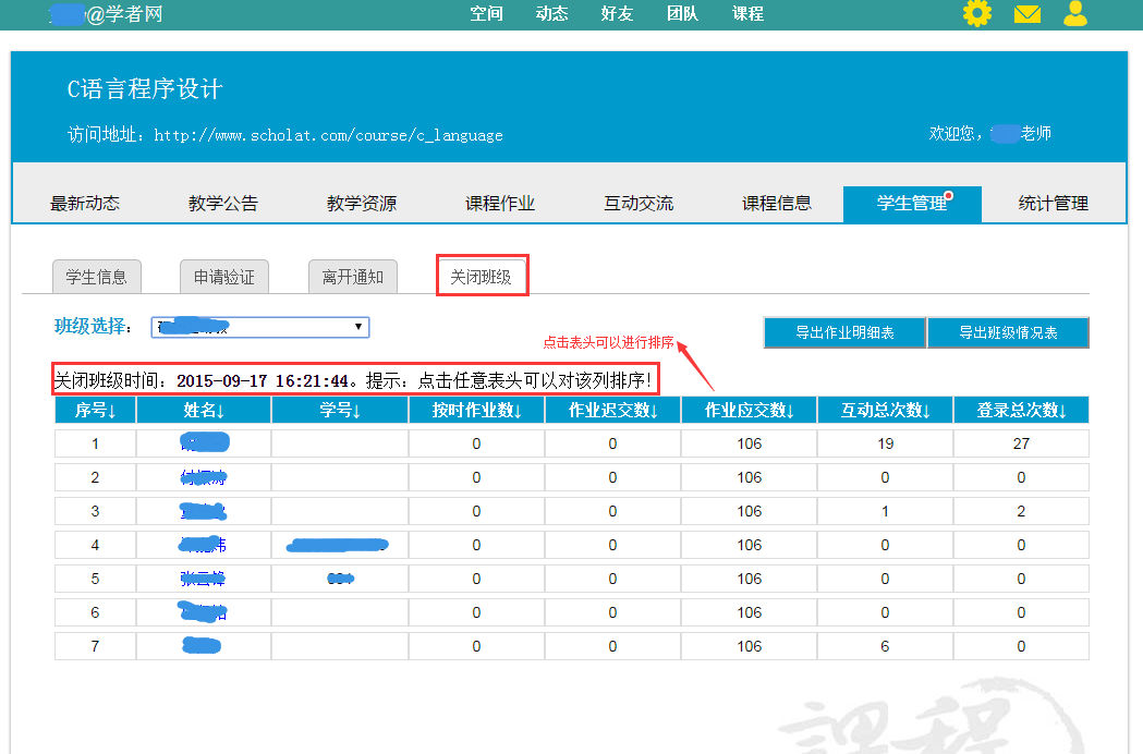 注1:關(guān)閉班級(jí)是指這門課里的這個(gè)班級(jí)的授課全部結(jié)束了,老師就關(guān)閉了這個(gè)班級(jí)的課時(shí),成功關(guān)閉之后在“關(guān)閉班級(jí)”模塊生成了一個(gè)這個(gè)班級(jí)所有學(xué)生的學(xué)習(xí)記錄表格,包括姓名、學(xué)號(hào)、作業(yè)提交情況、互動(dòng)總次數(shù)以及登錄總次數(shù),點(diǎn)擊表頭依舊可以進(jìn)行排序,老師可以導(dǎo)出作業(yè)明細(xì)表和班級(jí)情況表,以供老師對(duì)這個(gè)班級(jí)授課的考核使用。