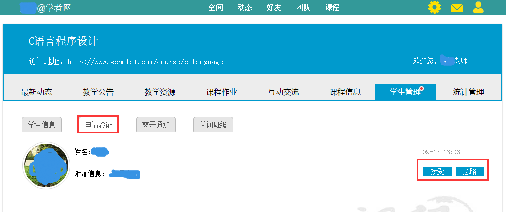 注:申請(qǐng)驗(yàn)證子模塊是顯示學(xué)生申請(qǐng)加入此門課的申請(qǐng)信息,包括申請(qǐng)人姓名、附加信息,老師可以通過(guò)此模塊查看申請(qǐng)人信息,然后進(jìn)行接受或者忽略操作