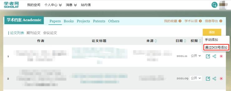 在“學(xué)術(shù)檔案”模塊下點(diǎn)擊“添加”按鈕下拉菜單中的“通過DOI號添加”功能