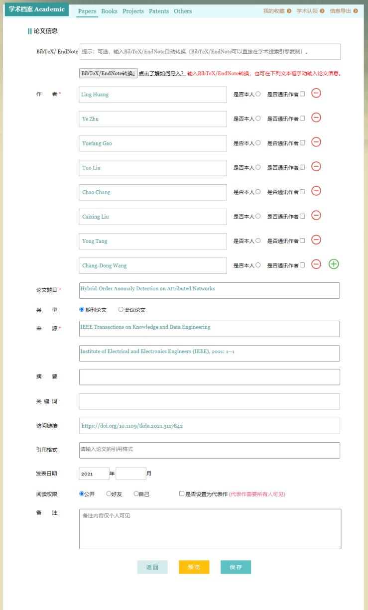 搜索成功后論文信息會顯示在編輯頁面,可以進(jìn)一步修改和補(bǔ)充,別忘了點(diǎn)擊“保存”哦!