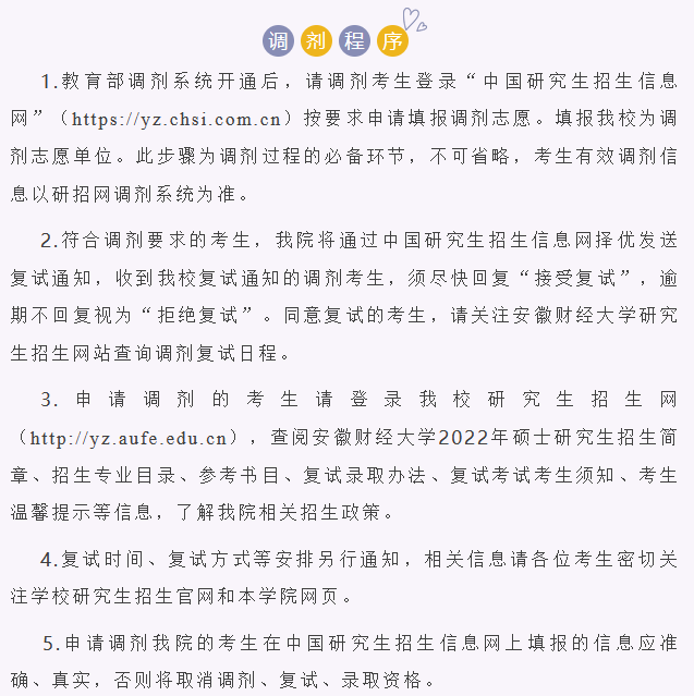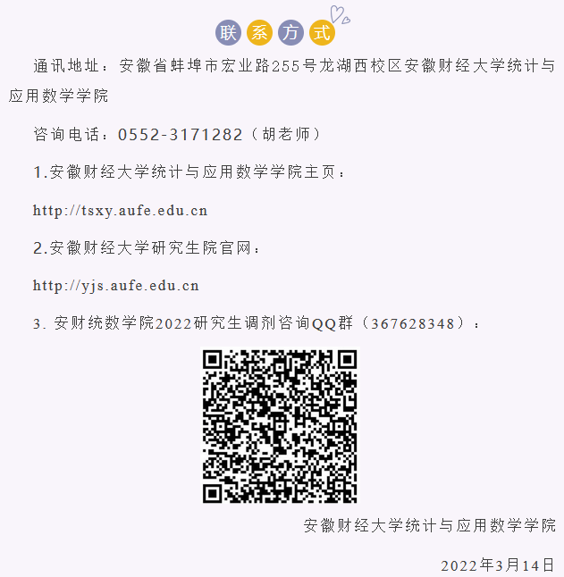 根據(jù)2022年全國碩士研究生招生考試考生進(jìn)入復(fù)試的初試成績(jī)基本要求和相關(guān)情況,安徽財(cái)經(jīng)大學(xué)統(tǒng)計(jì)與應(yīng)用數(shù)學(xué)學(xué)院2022年碩士研究生可能有少量?jī)?yōu)秀生源調(diào)劑需求,歡迎廣大優(yōu)秀考生申請(qǐng)調(diào)劑至我院學(xué)習(xí)深造。具體情況如下: