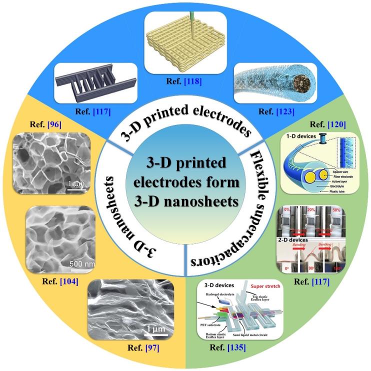 由于分層三維(3-D)納米片獨特的幾何特征和電子結(jié)構(gòu),它們顯示出優(yōu)異的電子遷移率、超高比表面積和可靠的結(jié)構(gòu)穩(wěn)定性。因此,三維納米片在電化學(xué)儲能領(lǐng)域具有廣闊的應(yīng)用前景。超級電容器具有充放電速度快、循環(huán)壽命長、安全穩(wěn)定等優(yōu)點,近年來受到廣泛關(guān)注。柔性化、小型化、智能化是超級電容儲能裝置的發(fā)展方向。新興的三維打印技術(shù),尤其是墨水直接寫入(IDW)模式,極大地提高了器件微結(jié)構(gòu)的設(shè)計能力和控制精度?;谖覀兓蚱渌麍F隊早期對三維石墨烯納米片和三維MXene納米片的研究進展,本綜述論文提出利用先進的三維打印技術(shù),利用具有高比電容的三維納米片活性材料,實現(xiàn)柔性全固態(tài)超級電容器的設(shè)計。系統(tǒng)分析了用三維打印技術(shù)設(shè)計叉指電極、多層骨架電極和纖維電極的方法,以及柔性超級電容器的性能評價。本綜述旨在為未來柔性全固態(tài)超級電容器的實際應(yīng)用提供新的概念和理論指導(dǎo),為三維打印構(gòu)建材料的設(shè)計、制備和性能優(yōu)化提供新的思路和理論指導(dǎo)。