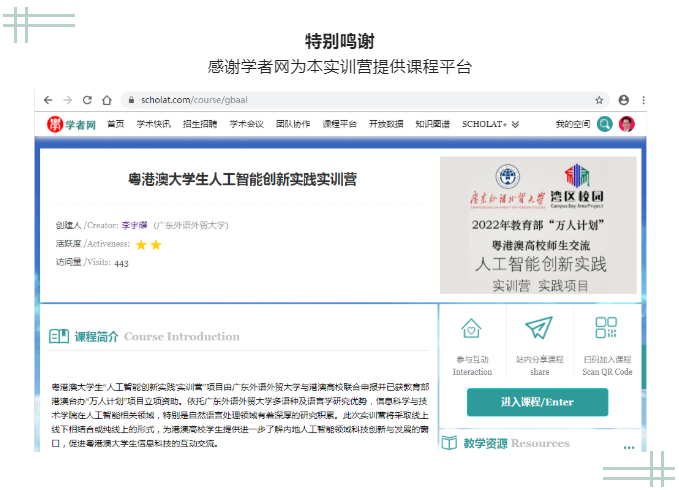 2022年7月10日至7月16日,教育部港澳臺辦“萬人計劃”立項項目之一,廣東外語外貿(mào)大學信息科學與技術學院/網(wǎng)絡空間安全學院承辦的粵港澳大學生“人工智能創(chuàng)新實踐”實訓營已于7月10日正式開營。