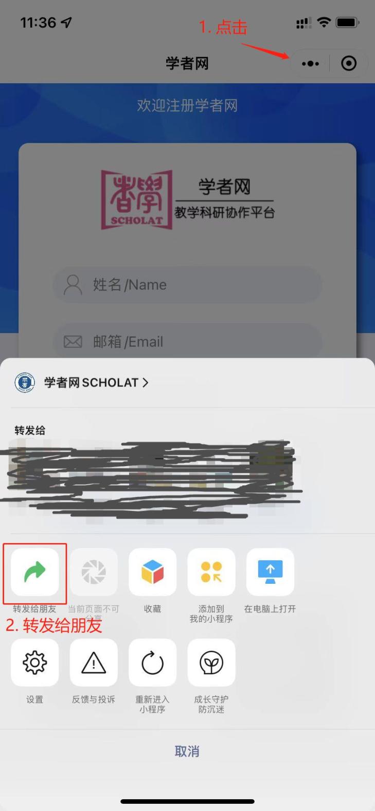 如有同事或同學(xué)想要注冊(cè)學(xué)者網(wǎng)賬號(hào),可在小程序中點(diǎn)擊右上角“···”,點(diǎn)擊“轉(zhuǎn)發(fā)給朋友”,將小程序分享給同事或同學(xué)。