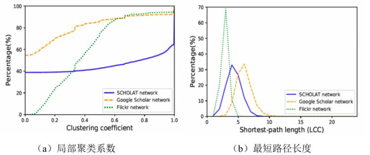 通過基于圖結(jié)構(gòu)指標(biāo)的比較發(fā)現(xiàn),學(xué)者網(wǎng)的社交關(guān)系圖具有小世界效應(yīng)(較高的聚類系數(shù)和較低的最短路徑長(zhǎng)度),可參考表1和圖1。