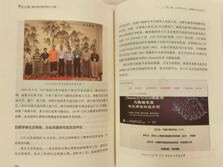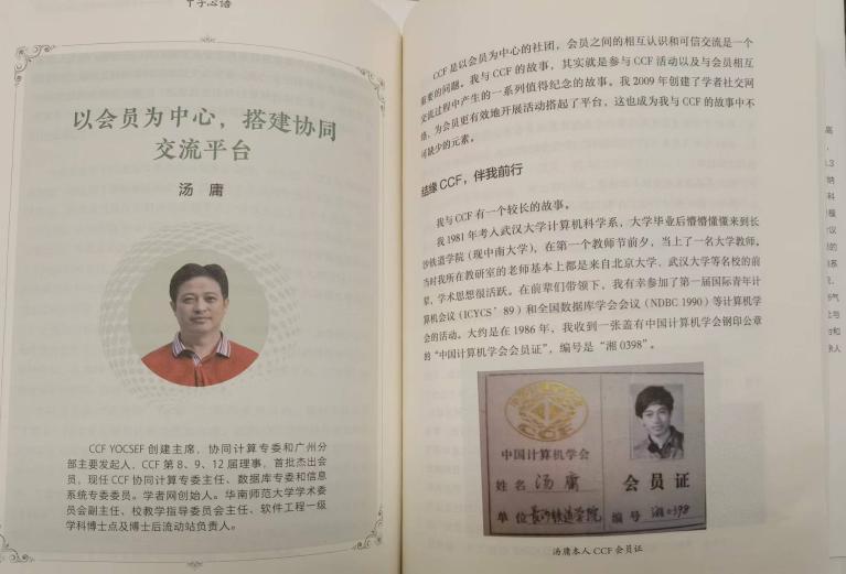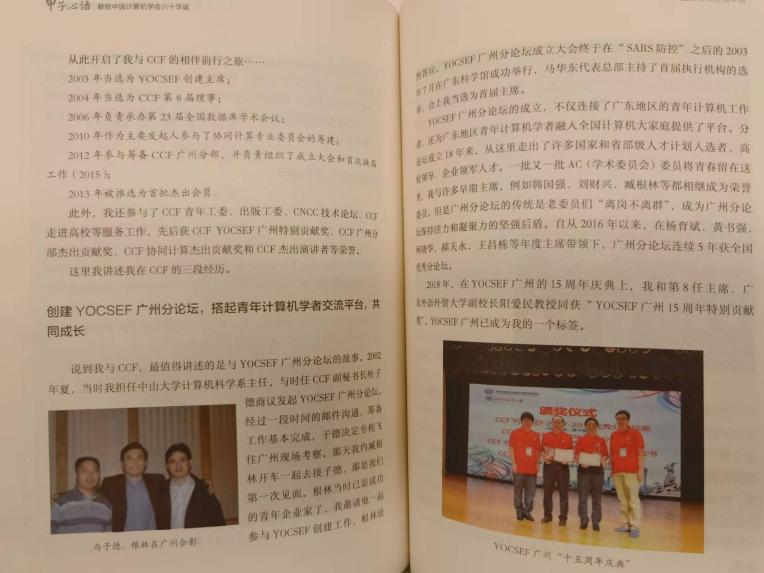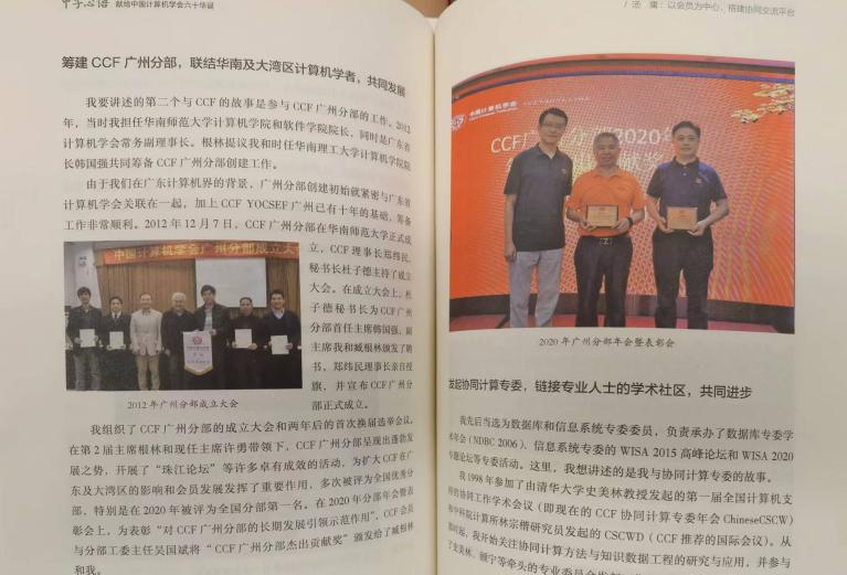 活動期間發(fā)行了《歲月掠影——中國計算機(jī)學(xué)會創(chuàng)建六十周年紀(jì)念冊》和《甲子心語——獻(xiàn)給中國計算機(jī)學(xué)會六十華誕》,本人榮幸在其中留下了幾朵小”浪花“:在《歲月掠影》中出現(xiàn)4次名字(湯庸),在《甲子心語》中收錄本人文章《以會員為中心,搭建協(xié)同交流平臺》,另黃書強(qiáng)、許勇的《CCF廣州分部的發(fā)展之道》和臧根林的《莫道江湖遠(yuǎn)、轉(zhuǎn)身又相逢》也提及本人的工作,感謝!感恩!