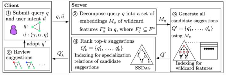 圖查詢(xún)自動(dòng)完成(GQAC)將用戶(hù)的圖查詢(xún)作為輸入,并生成前k個(gè)查詢(xún)結(jié)果建議作為輸出,以幫助減輕可視化界面中冗長(zhǎng)且容易出錯(cuò)的圖查詢(xún)過(guò)程。要使用GQAC組合目標(biāo)查詢(xún),用戶(hù)可以迭代地采用建議或手動(dòng)添加邊以擴(kuò)充現(xiàn)有查詢(xún)。然而,當(dāng)前最先進(jìn)的GQAC方法只關(guān)注大量中小型圖?,F(xiàn)有GQAC方法所利用的子圖特征在大圖中要么太小,要么太少。對(duì)此,本文提出了用于大圖的靈活圖查詢(xún)自動(dòng)完成方法,簡(jiǎn)稱(chēng)為FLAG,框架如圖1所示。本文首次在GQAC 的上下文中提出通配符標(biāo)簽,并總結(jié)了具有不同標(biāo)簽的查詢(xún)結(jié)構(gòu)。FLAG允許使用帶有通配符標(biāo)簽的子圖增量來(lái)擴(kuò)展用戶(hù)的查詢(xún)以形成建議。為了支持啟用通配符的建議,本文提出了一種新的建議排名功能,提出一種高效的排名算法并通過(guò)擴(kuò)展索引來(lái)進(jìn)一步優(yōu)化在線建議排名。本文進(jìn)行了用戶(hù)研究和一組大規(guī)模模擬實(shí)驗(yàn),以驗(yàn)證FLAG的有效性和效率。結(jié)果表明,查詢(xún)建議節(jié)省了大約50%的鼠標(biāo)點(diǎn)擊,F(xiàn)LAG在幾秒鐘內(nèi)返回建議。該論文在已有工作基礎(chǔ)上的主要貢獻(xiàn)如下: