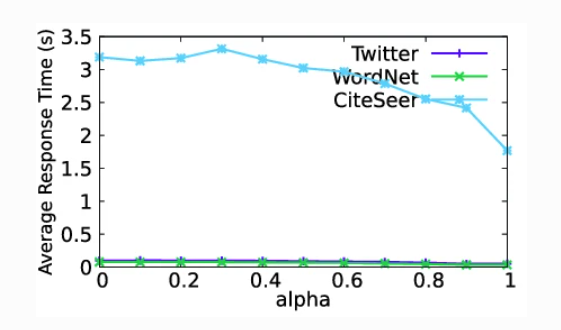 圖3展示了僅改變排名函數(shù)的α時(shí)FLAG的ART。將α范圍從0到1,ART總是少于3.5s。同時(shí),當(dāng)α接近1時(shí),ART會(huì)下降。α的值越高,GQAC過(guò)程更喜歡具有大專(zhuān)業(yè)化和小摘要的建議,這導(dǎo)致更新候選建議的摘要的時(shí)間更短。