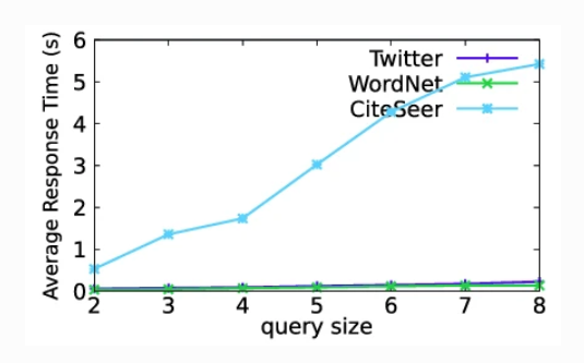 圖5展示了僅改變目標(biāo)查詢(xún)大小|q|時(shí)FLAG的ART。結(jié)果表明,對(duì)于最多8條邊的查詢(xún),F(xiàn)LAG的自動(dòng)完成過(guò)程在6秒內(nèi)完成。查詢(xún)大小|q|增加時(shí),ART增加,主要是因?yàn)榇笮筒樵?xún)需要更多時(shí)間來(lái)生成更多候選建議,然后對(duì)它們進(jìn)行排名。