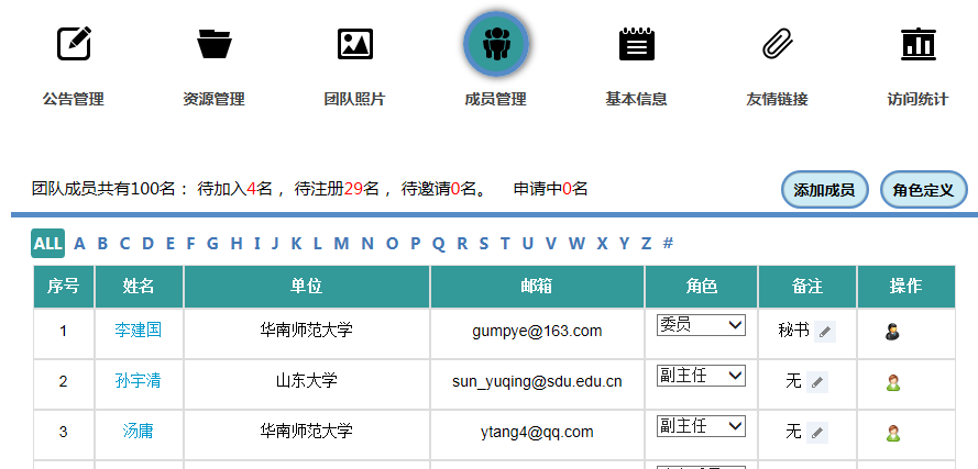 列表方式顯示所有成員(含正在邀請(qǐng)中的成員,例如圖中沒(méi)有鏈接的黑色字體為邀請(qǐng)中的非學(xué)者網(wǎng)用戶成員)