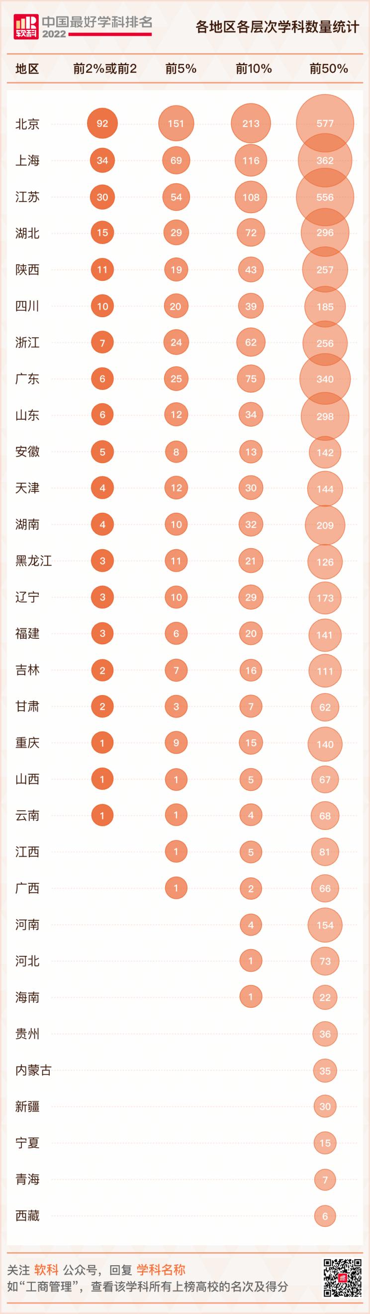 從各省級(jí)行政區(qū)的上榜學(xué)科數(shù)量分布看,北京占據(jù)絕對(duì)優(yōu)勢(shì),在各層次的學(xué)科數(shù)都高居全國(guó)第一。上海的前2名或前2%的頂尖學(xué)科數(shù)、前5%學(xué)科數(shù)、前10%學(xué)科數(shù)均位列全國(guó)第二,優(yōu)勢(shì)明顯。江蘇的前50%學(xué)科數(shù)位列全國(guó)第二,彰顯了名副其實(shí)“高教大省”的整體實(shí)力。湖北、陜西、四川等省的頂尖學(xué)科數(shù)量都處于國(guó)內(nèi)前列。廣東、山東、浙江的上榜學(xué)科總數(shù)優(yōu)勢(shì)明顯。