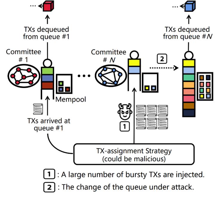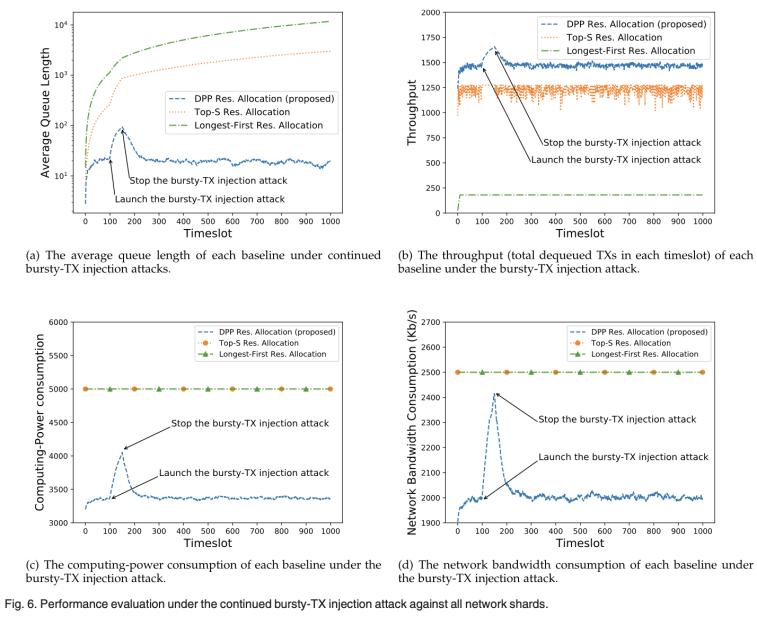 在使用分片技術(shù)的云端區(qū)塊鏈中,惡意的交易分配策略可能會(huì)向某些目標(biāo)分片突發(fā)注入大量交易。此外,在云端許可鏈的環(huán)境中,資源預(yù)算要比傳統(tǒng)區(qū)塊鏈中的共識(shí)資源要更有限。這是因?yàn)閭鹘y(tǒng)區(qū)塊鏈(例如比特幣區(qū)塊鏈)的共識(shí)資源是由世界各地的礦工提供的。不同的是,部署在云端的區(qū)塊鏈的資源是由數(shù)據(jù)中心或者商業(yè)云服務(wù)提供商所提供的。因此,即便在突發(fā)交易注入攻擊的威脅存在的情況下,如何在資源有限的云端區(qū)塊鏈中保持各個(gè)分片區(qū)塊鏈的穩(wěn)定運(yùn)行成為了一個(gè)挑戰(zhàn)。另一方面,盡管現(xiàn)有的區(qū)塊鏈分片研究已經(jīng)提出了許多針對(duì)分片區(qū)塊鏈的交易上鏈的解決方案,但我們?nèi)詻](méi)有發(fā)現(xiàn)可行的方案可以解決區(qū)塊鏈分片的穩(wěn)定性問(wèn)題。因此,云端區(qū)塊鏈管理員迫切需要一種新的策略來(lái)處理許可鏈分片中的不均衡的交易負(fù)載。為此,本文將分片許可鏈的負(fù)載不均衡定義為多隊(duì)列系統(tǒng)的穩(wěn)定性問(wèn)題。在該多隊(duì)列系統(tǒng)中,由于異常的交易執(zhí)行或惡意的交易分配策略為某些分片分配了大量的交易,這種行為可能會(huì)導(dǎo)致該分片出現(xiàn)擁塞。為了緩解部分分片出現(xiàn)的擁塞問(wèn)題,本文采用了李雅普諾夫優(yōu)化框架來(lái)解決穩(wěn)定性問(wèn)題。本文提出的策略根據(jù)觀察到的每個(gè)分片的交易池狀態(tài),決定如何通過(guò)分配區(qū)塊鏈網(wǎng)絡(luò)資源來(lái)保持分片區(qū)塊鏈穩(wěn)定的同時(shí)最小化云端區(qū)塊鏈系統(tǒng)的運(yùn)行成本。